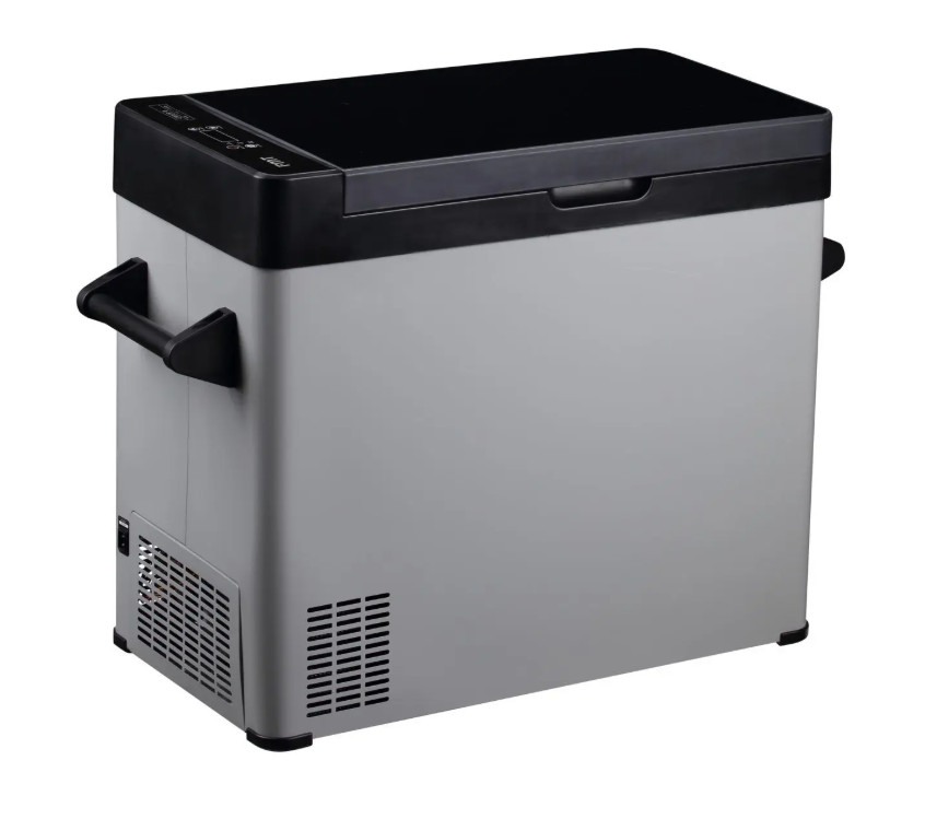 Praktische koelbox van grijs metaal. De Q-serie heeft een accubeschermer, antivibratie en wordt geleverd met een 12V-stekker en is daarom zeer geschikt voor transport en kamperen.