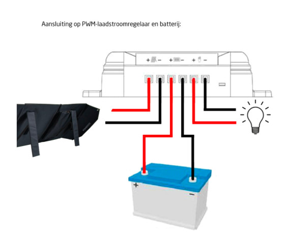 Tussen het zonnepaneel en de PWM zit 1 meter bekabeling en tussen de te plaatsen accu en de PWM zit 2 meter bekabeling. De PWM zit er dus zwevend tussen.