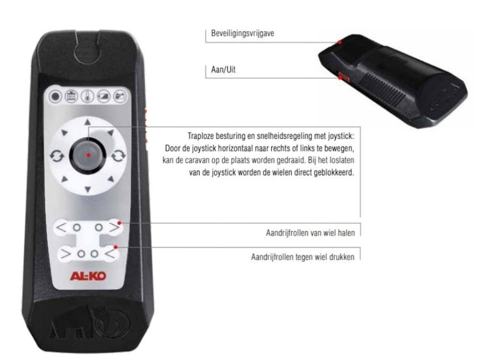 Afstandsbediening voor Mammut mover AMS 2. Voor movers vanaf 2015) De afstandsbediening van de AL-KO AMS Mammut is simpel en comfortabel te gebruiken. De ergonomisch gevormde afstandsbediening is door de slimme joystick volledig met één hand te bedienen. Zowel de snelheid als de besturing zijn traploos te regelen. De caravan kan continu in variabele richtingen worden bijgestuurd. De aandrijfrollen worden elektrisch en volledig automatisch op de wielen geplaatst, met slechts een druk op de knop. De elektronica zorgt automatisch voor de maximale toegestane drukkracht op de wielen. De afstandsbediening is voorzien van een unieke statusweergave.
