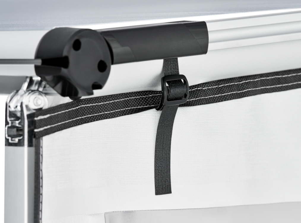 Gemakkelijk en snel te installeren; schuift in de aluminium spanstang die tussen de cassette en de voorlijst van de luifel aangebracht wordt.