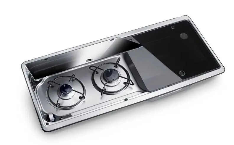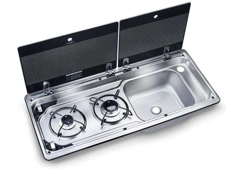 Dometic 2 pits kook spoelcombinatie met glazen afdekplaten. Koken op 2 pitten in een kleine ruimte is mogelijk met deze kook- spoelcombinatie. Als je het fornuis of de spoelbak niet gebruikt kan je het als aanrecht gebruiken als je de glasplaten sluit. Spanning 12V elektrische ontsteking. Uitgangsvermogen: 1x1,0KW
