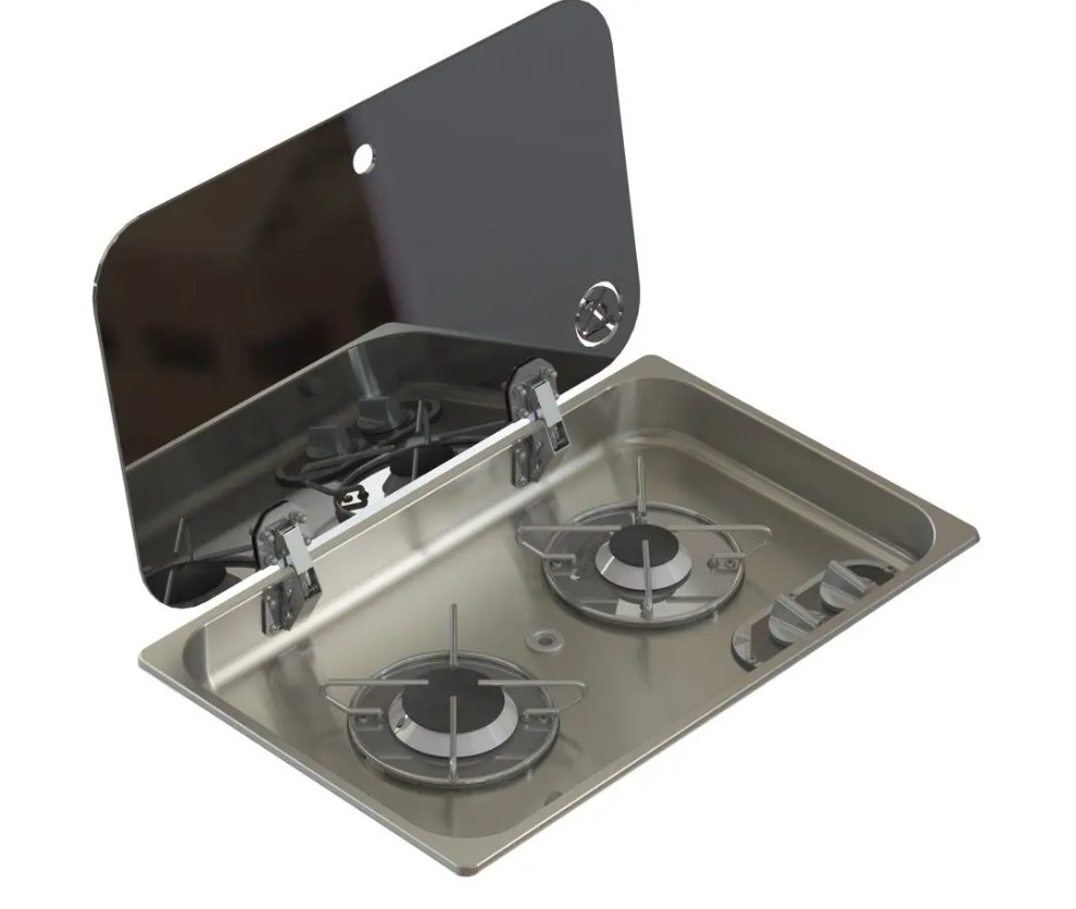 RVS Inbouwkookplaat met fraai afgewerkt glazen deksel. Uitgerust met 2 branders.